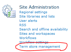 If you’ve ever used the Records Center or one of the other templates that has it, you might wonder how you can get the Term store management link to show up under the Site Administration section of your Site Settings page as shown below.