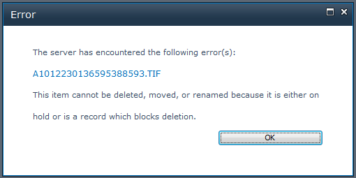 This item cannot be deleted, moved, or renamed because it is either on hold or is a record which blocks deletion.