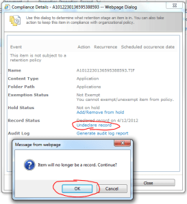In order to remove the document, it can’t be a record nor be part of any holds. In the compliance details popup remove the document from hold (if necessary) and click the Undeclare record link. In the confirmation dialog choose OK to undeclare.