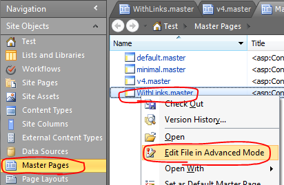 Open your site in SharePoint Designer (Site Actions -> Edit in SharePoint Designer). Choose Master Pages in the Navigation pane and right-click on v4.master and choose Copy then right-click and choose Paste. Right-click on the new Master Page, v4_copy(1).master, and choose Rename. Once you’ve renamed it, right-click on it and select Edit File in Advanced Mode:
