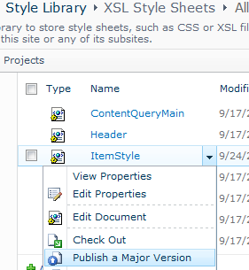 So where do we put the above XSL? In your site collection’s Style Library there is a folder called XSL Style Sheets. Open the ItemStyle.xsl file and scroll all the way to the bottom. Just before the final node, </xsl:stylesheet>, paste the above XSL. Since this is just a named template, this won’t affect anything else within your site collection. Upload the changed ItemStyle to the XSL Style Sheets folder and make sure to Publish a major version of the file so everyone can see it: