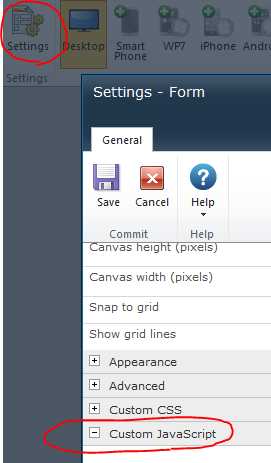 To add JavaScript to Nintex Forms, from the Form editor click the Settings button in the Ribbon and then expand the Custom JavaScript section at the bottom: