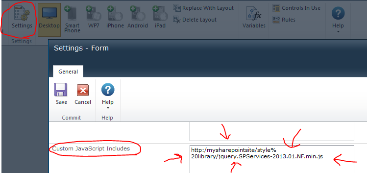 To reference that file go back to the Nintex Form editor and click that Settings button again and expand the Advanced section. Scroll down to the Custom JavaScript Includes section and add the address of the script you just uploaded (If you have multiple JavaScript Includes you just put one on each line):