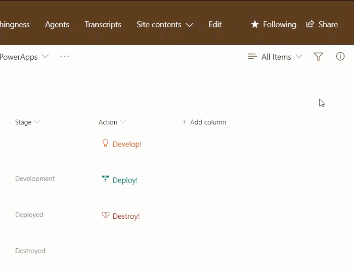 In the list above, we have 3 separate flows (Develop, Deploy, and Destroy). We want to only prompt the user to launch one of these based on the value of the Status column in the list item. You could argue that it might make more sense to launch a single flow that handles the conditional logic directly. Sure, but customizing the text, icon, and color to make it obvious to the user what action they are taking is still an awesome thing to do.