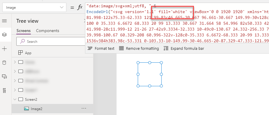 Although we can add an SVG file as media and use it that way, I like to have a little more control. So, let’s add an Image control to your App. In the Image property we’re going to replace SampleImage with some text. The first bit of text is just a string: