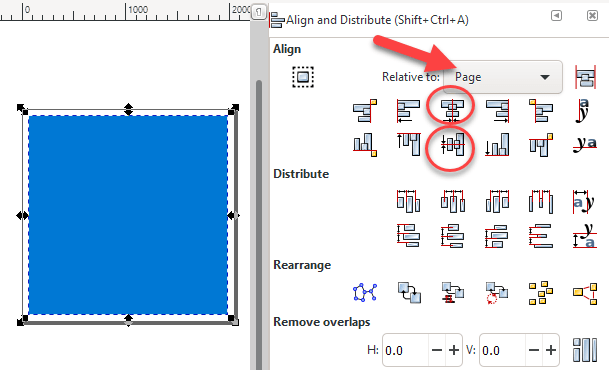 Now we’re going to line them up. Open the Align and Distribute panel (Object > Align and Distribute). Select both the box and your icon. Ensure the Relative to dropdown is set to Page then click the Center on Vertical Axis button followed by the Center on Horizontal Axis button. Your box should be totally covering your icon now.