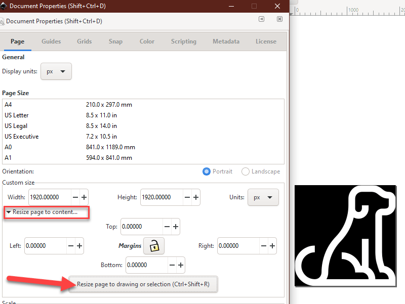 You’ll notice we’ve got an extra space around the icon and the document size (seen as a black square above). This is because our icon wasn’t perfectly centered before. If your icon looks good, skip ahead. To fix it, however, go to Document Properties (File > Document Properties). In the Custom Size options group, expand the Resize page to content section and click Resize page to drawing or selection.