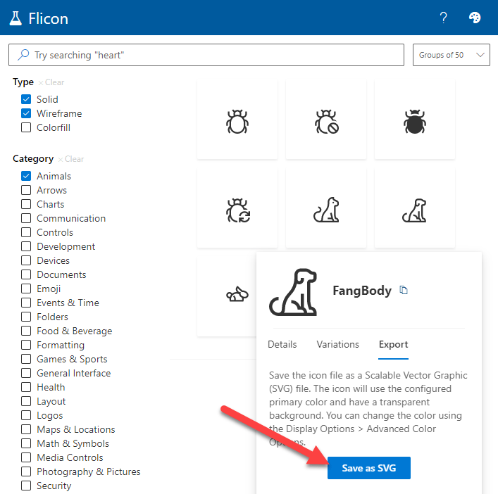 If you haven’t used Flicon.io before, just search for an icon you want to use or browse with the categories. Once you’ve got an icon in mind, hover over it and switch to the Export tab. You can mess around with colors if you’d like, but it isn’t really necessary for what we’re doing. Just click Save as SVG: