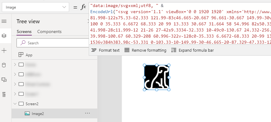 Although we can add an SVG file as media and use it that way, I like to have a little more control. So, let’s add an Image control to your App. In the Image property we’re going to replace SampleImage with some text. The first bit of text is just a string: