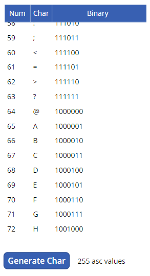 A quick search came across this excellent article by Tim Leung, Text – How to convert a character to its ASCII numeric value. In this post, Tim lays out a method to generate a collection using the Char function against numbers 0-255 that can then be used to lookup the ASCII value and he does it all in a single line. If that’s all you’re here for, then click on that link and you’re done. In our case, we need to go just a little farther and be able to get the binary equivalent of the ASCII value for a character so we’ll be combining Tim’s technique with our integer to binary conversion logic laid out previously.