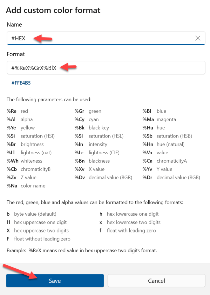 2. As you can see from all the parameters and options, this thing is super flexible. Our format is “relatively” straight-forward. Name the format #HEX and paste #%ReX%GrX%BlX for the Format value then click Save: