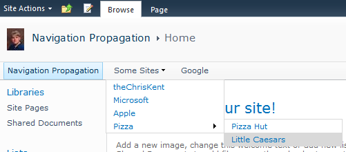 What happened? We can see Pizza but it’s not a sub menu like we expected! These nodes are all there but by default SharePoint doesn’t show them. You’ll need to adjust your Master Page using the techniques in this article: Multi-Level Top Link Bar Navigation (Sub Menus). Once you’ve done that you’ll see something like this: