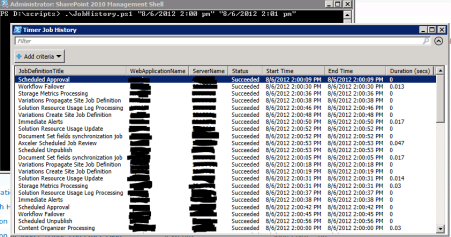 Line 12 actually creates the job with my default parameters and then line 15 sets a Title. This is where you would introduce a schedule if you wanted the job to run more than once, but if not just call Update() to save your job. I want my job to run immediately, so in line 17 I call the RunNow() method to do exactly that.